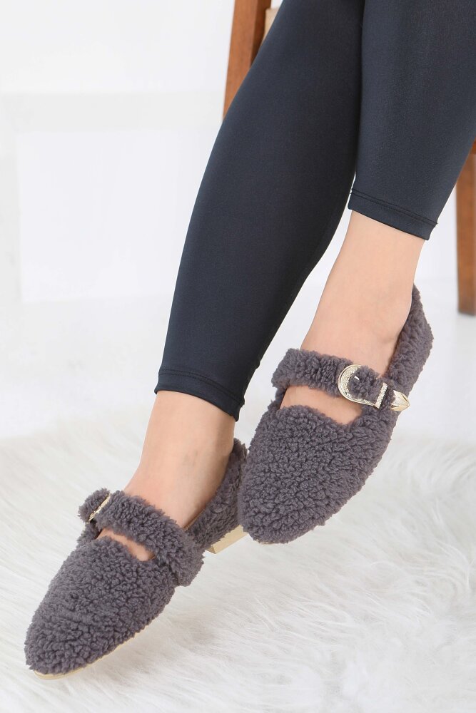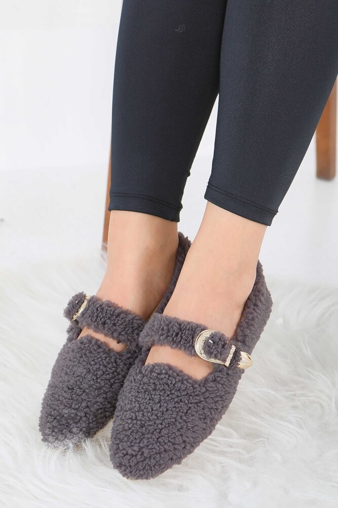 Kadın Antrasit Kemer Detaylı Peluş Babet - 27910-ANTRASIT