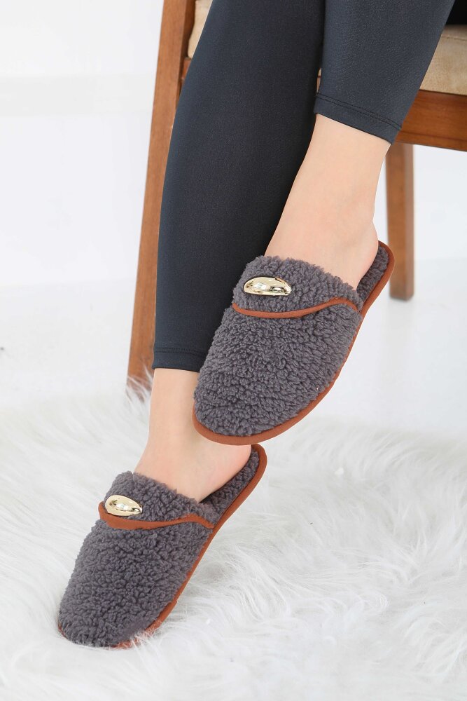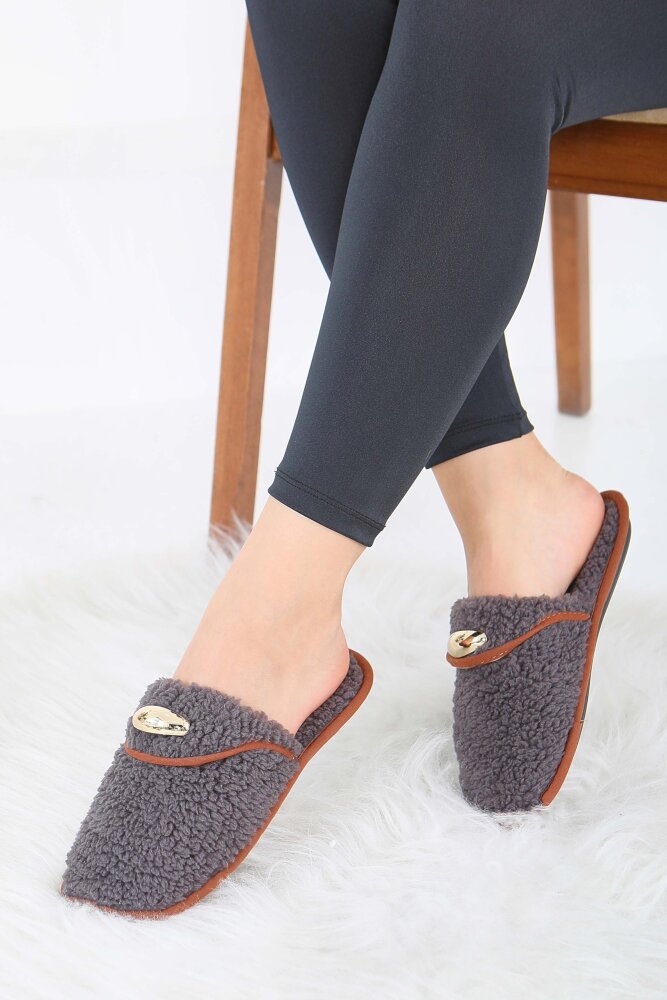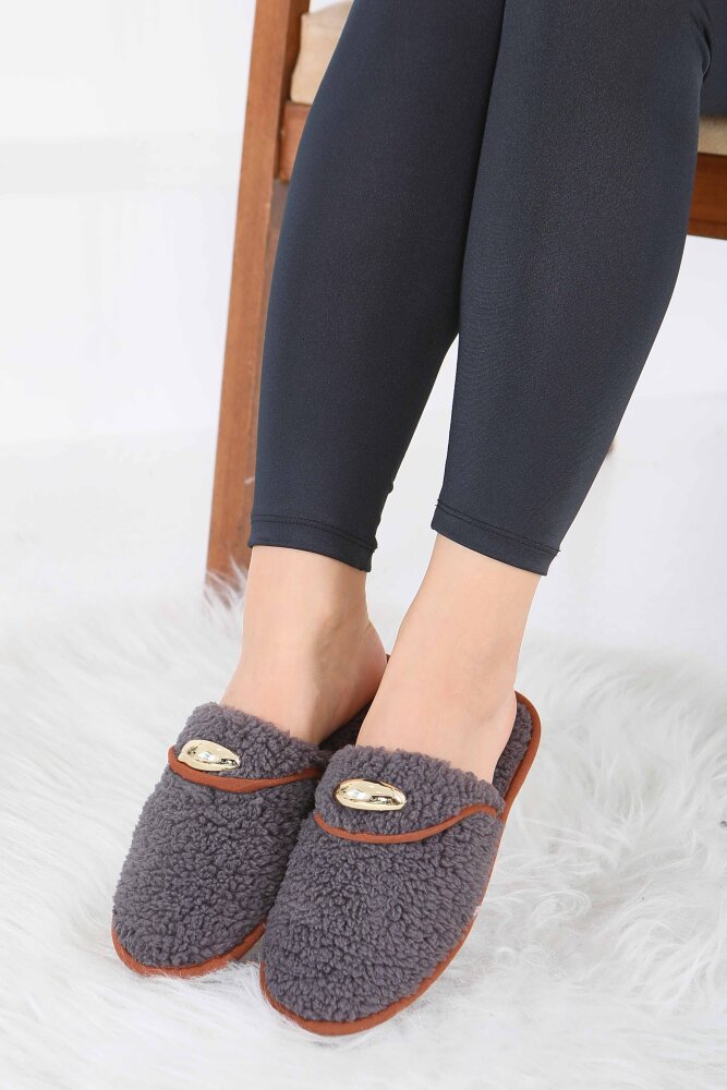 Kadın Antrasit Tokalı Peluş Ev Terliği - 27912-ANTRASIT