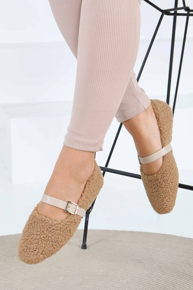 Kadın Bej Peluş Kemerli Babet - 27792-BEJ