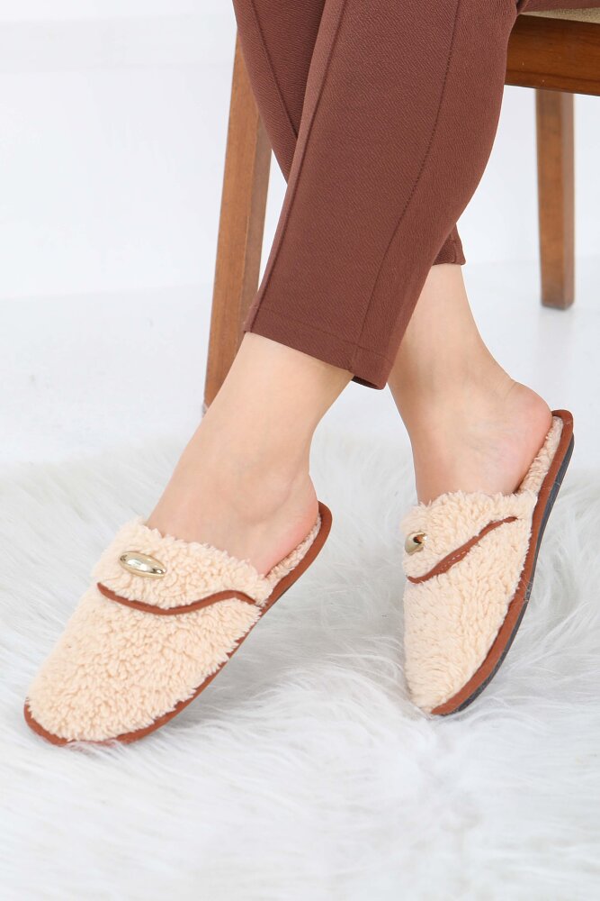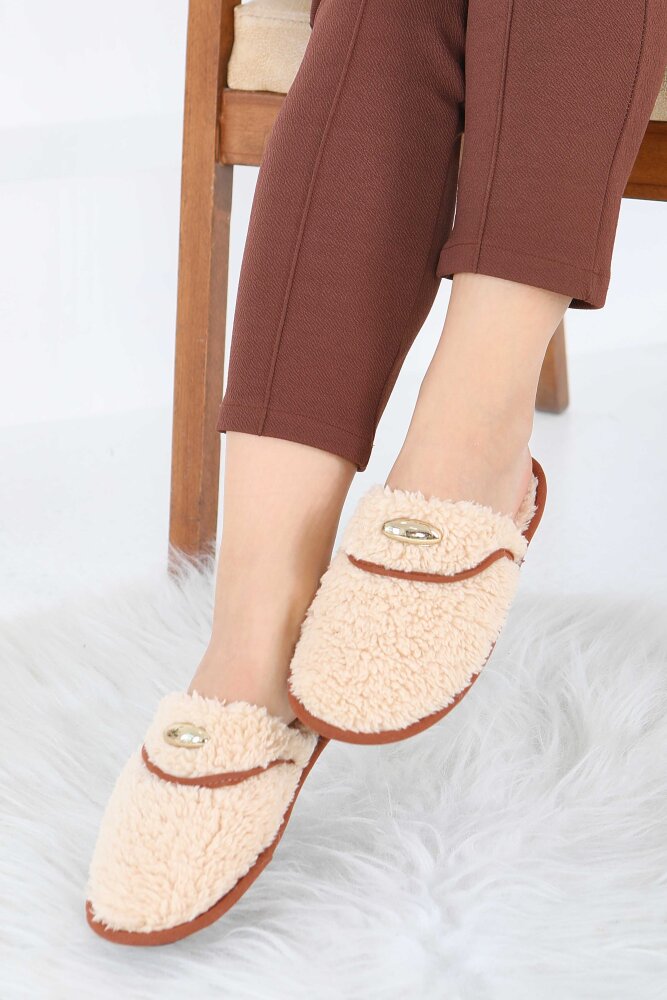 Kadın Bej Tokalı Peluş Ev Terliği - 27912-BEJ