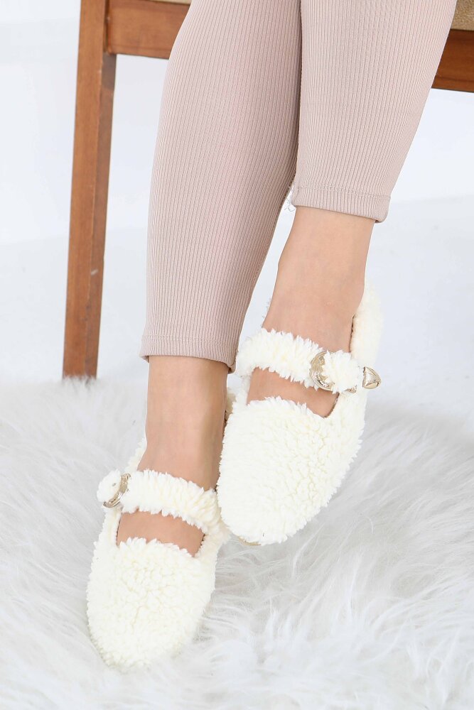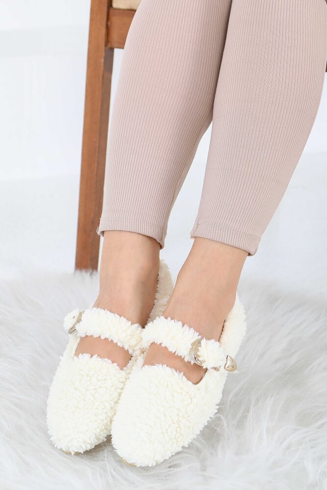 Kadın Ekru Kemer Detaylı Peluş Babet - 27910-EKRU