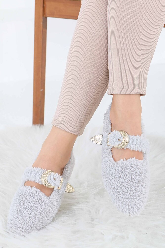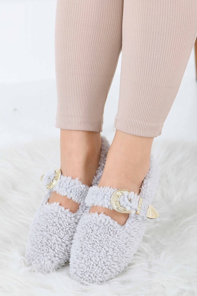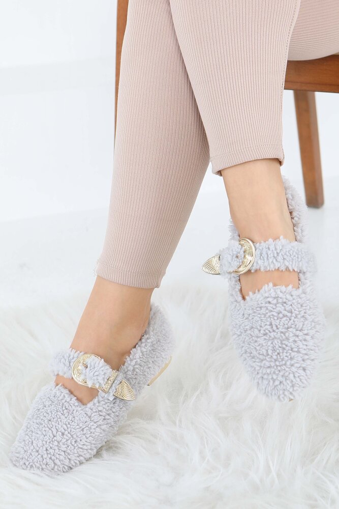 Kadın Gri Kemer Detaylı Peluş Babet - 27910-GRI