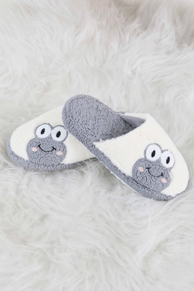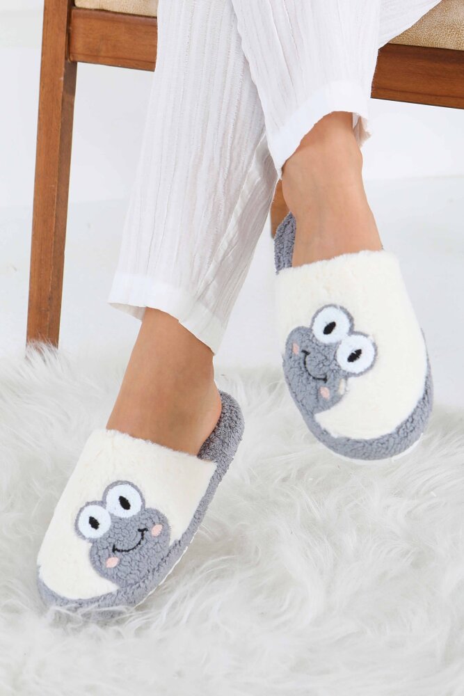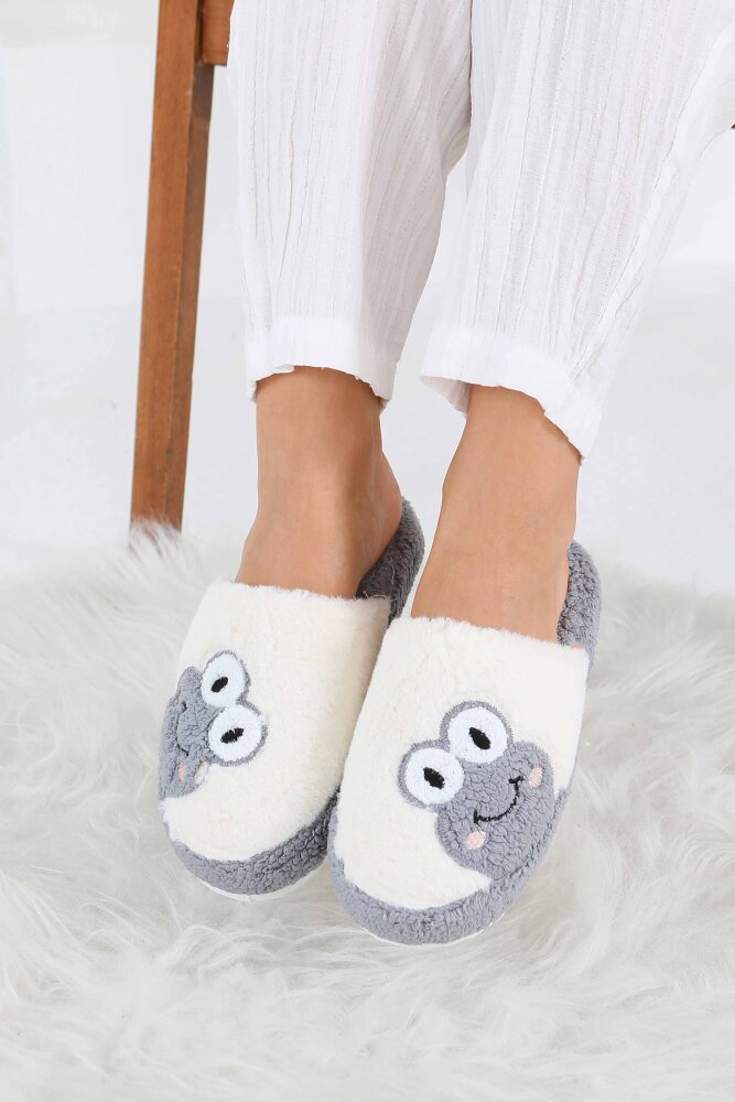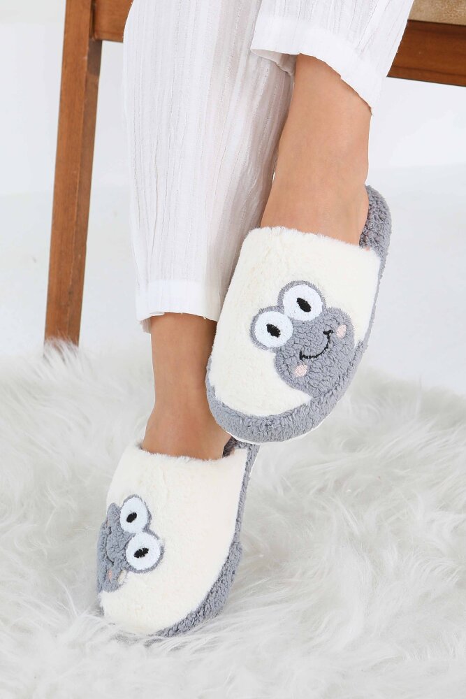 Kadın Gri Kurbağa İşlemeli Ev Terliği - 27779-GRI