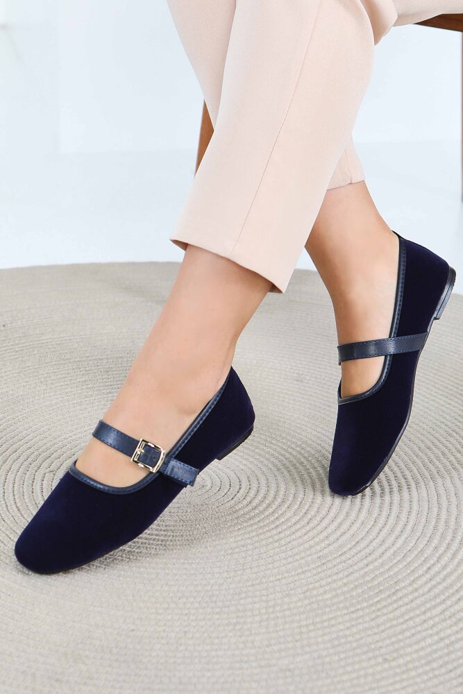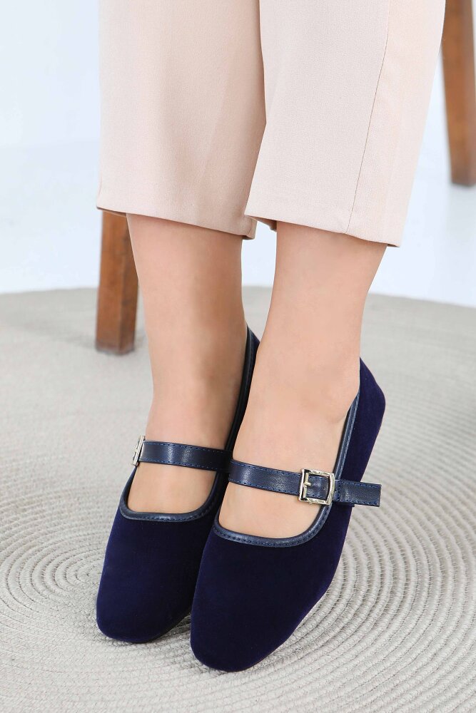 Kadın Lacivert Kemerli Süet Babet - 27791-LACIVERT