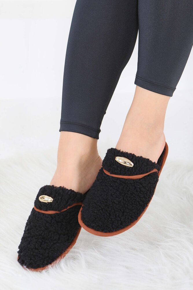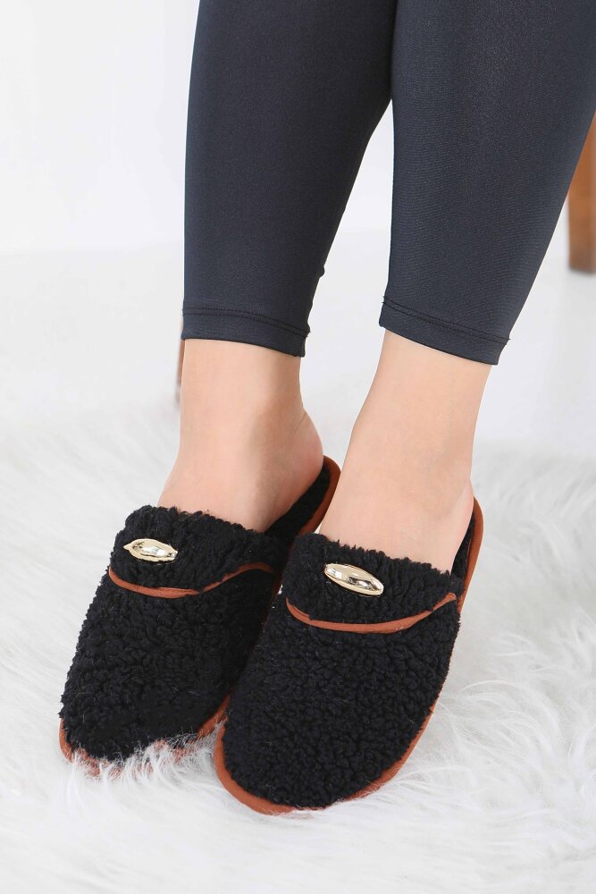 Kadın Siyah Tokalı Peluş Ev Terliği - 27912-SIYAH