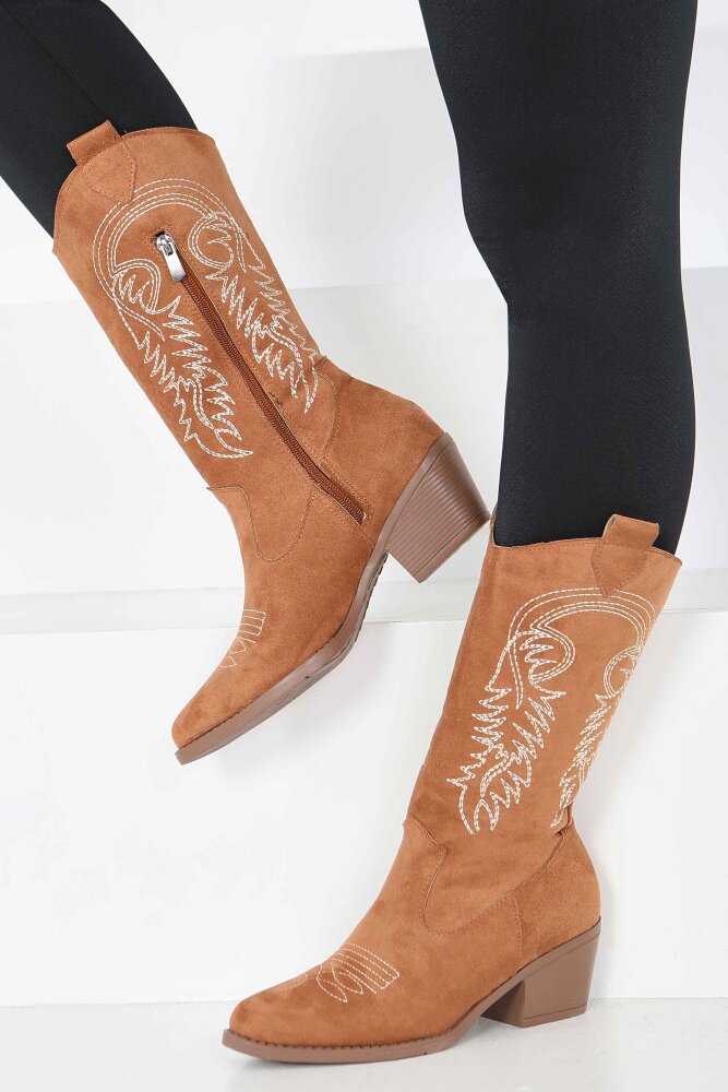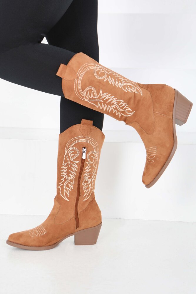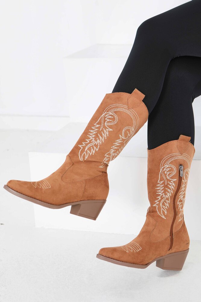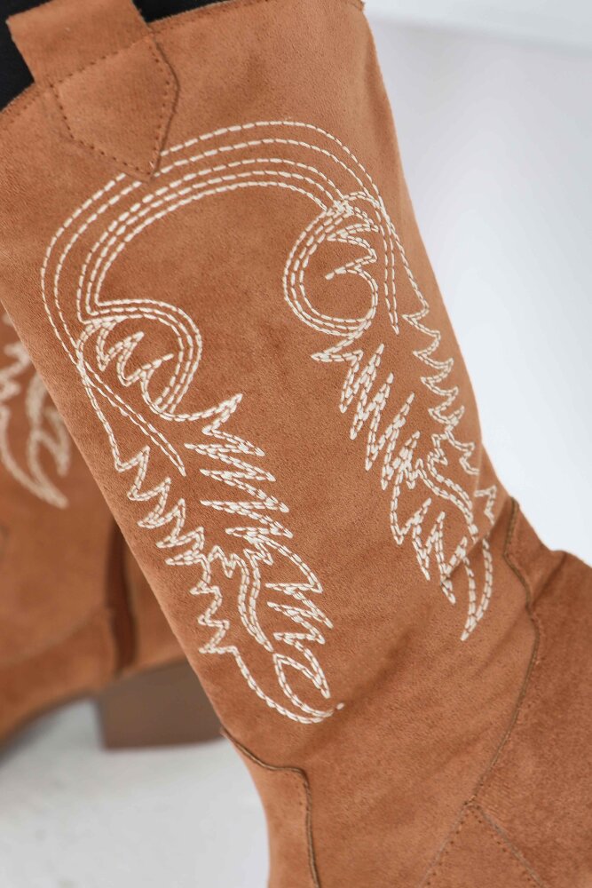 Kadın Taba Nakışlı Kovboy Fermuarlı Süet Çizme - 27851-TABA