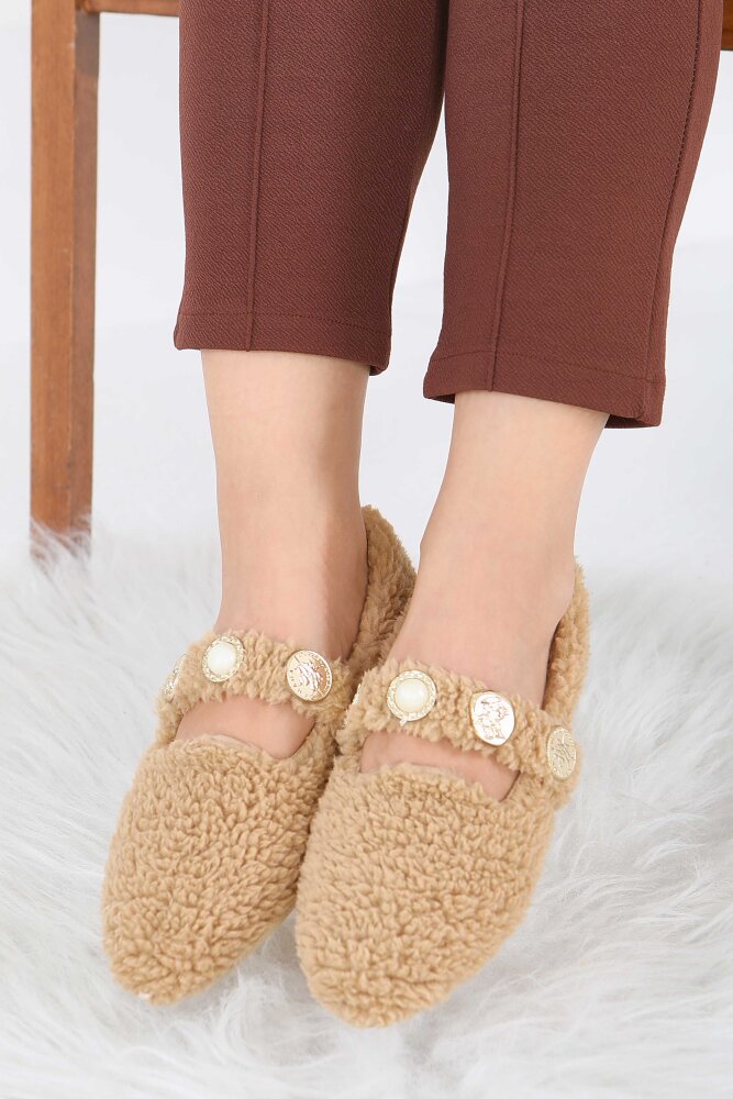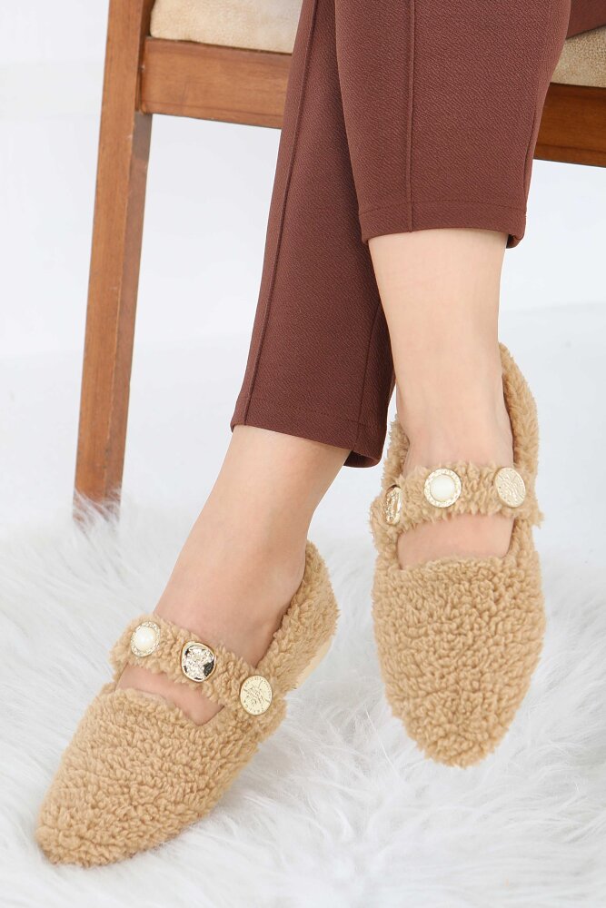 Kadın Vizon İnci Ve Tuğra Detaylı Peluş Babet - 27911-VIZON