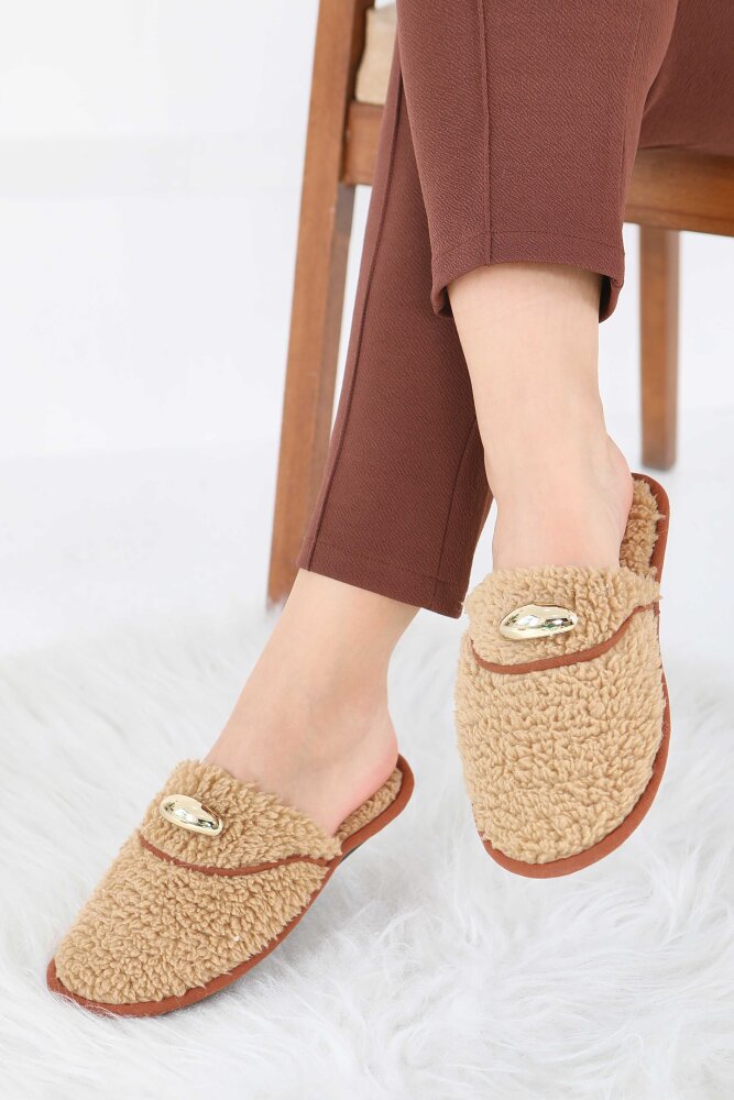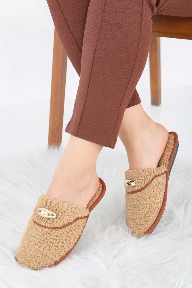 Kadın Vizon Tokalı Peluş Ev Terliği - 27912-VIZON