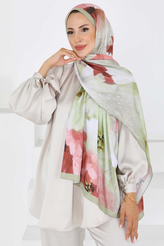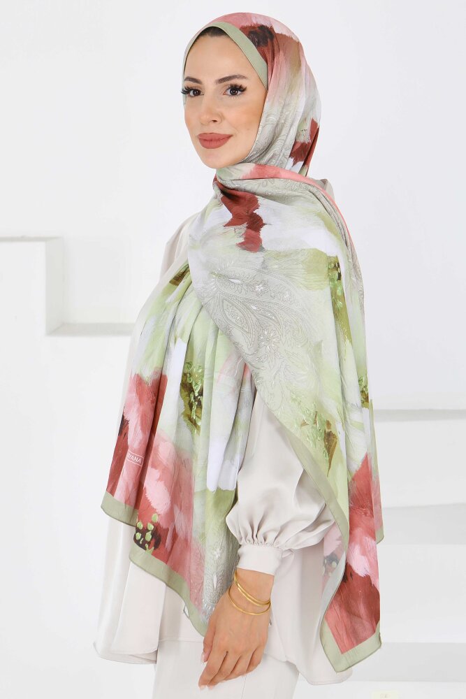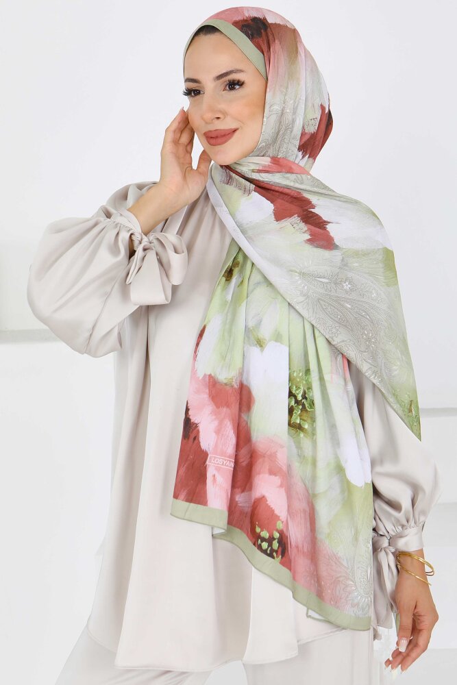 Kıraş Büyük Çiçek Desenli Şal Yağ Yeşili - 27621